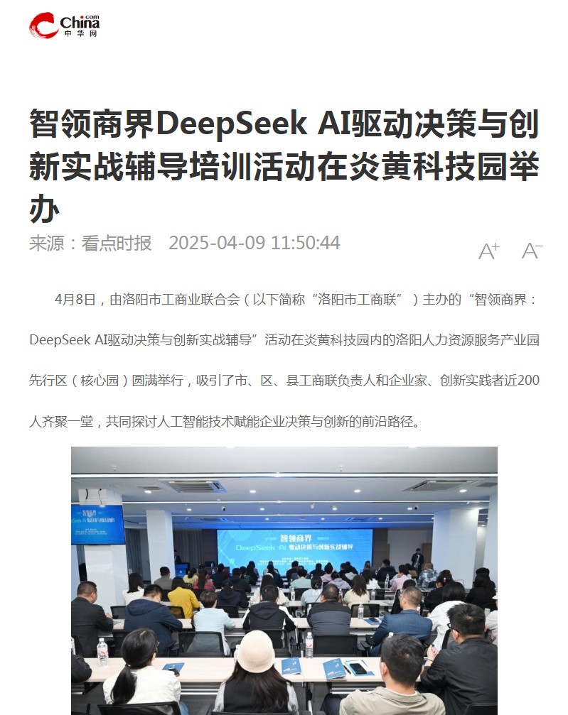 4月8日,“智領(lǐng)商界:DeepSeek AI驅(qū)動決策與創(chuàng)新實戰(zhàn)輔導”培訓活動在炎黃科技園舉行,轉(zhuǎn)發(fā)洛陽日報、中華網(wǎng)的相關(guān)報道——