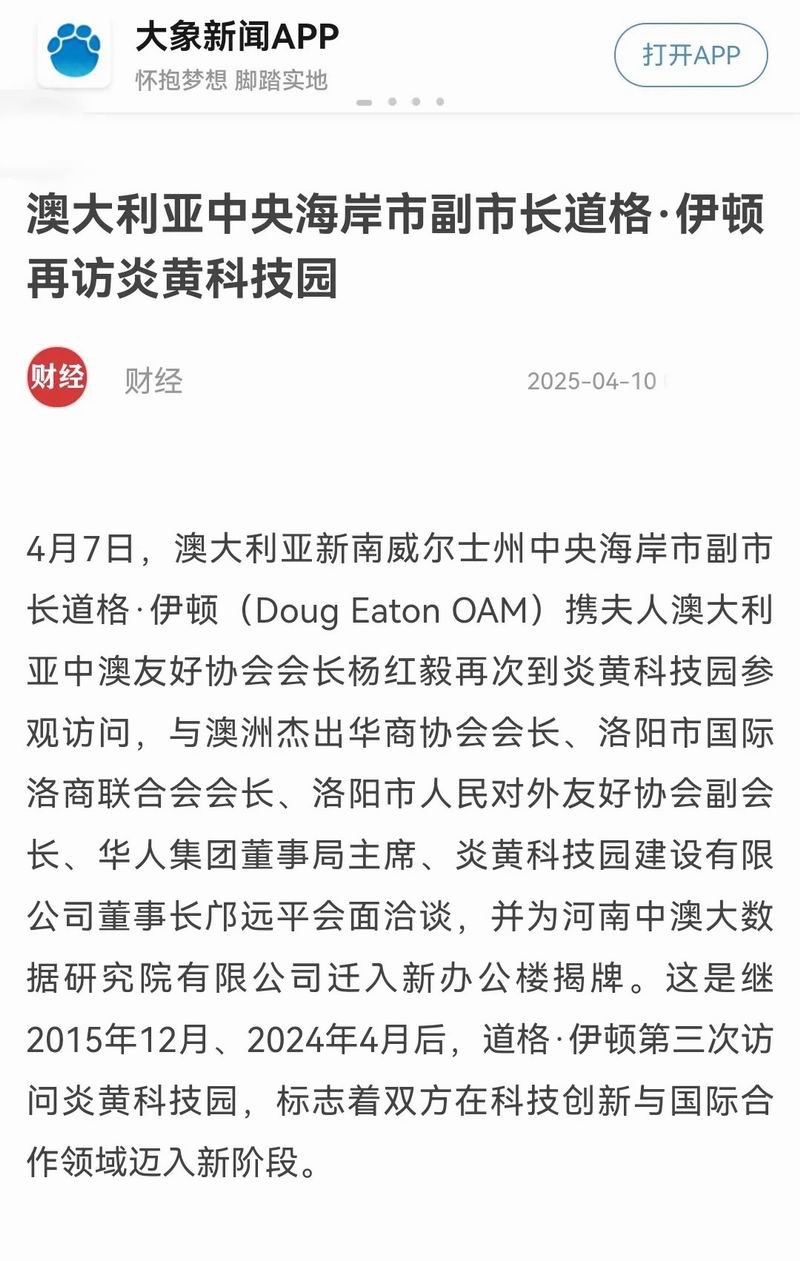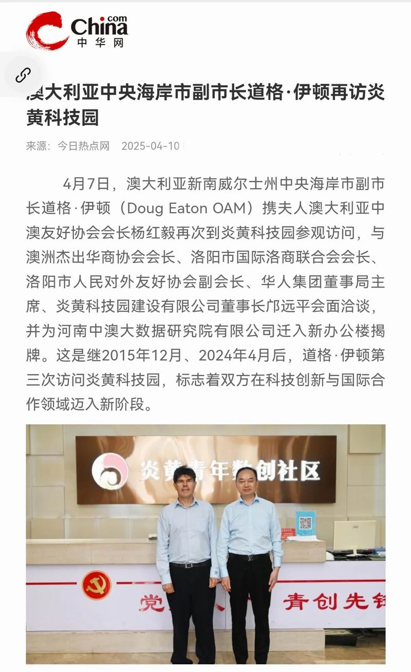 4月7日,澳大利亞新南威爾士州中央海岸市副市長道格·伊頓(Doug Eaton OAM)攜夫人澳大利亞中澳友好協(xié)會會長楊紅毅再次到炎黃科技園參觀訪問,與澳洲杰出華商協(xié)會會長、洛陽市國際洛商聯(lián)合會會長、洛陽市人民對外友好協(xié)會副會長、華人集團(tuán)董事局主席、炎黃科技園建設(shè)有限公司董事長鄺遠(yuǎn)平會面洽談,并為河南中澳大數(shù)據(jù)研究院有限公司遷入新辦公樓揭牌。這是繼2015年12月、2024年4月后,道格·伊頓第三次訪問炎黃科技園,標(biāo)志著雙方在科技創(chuàng)新與國際合作領(lǐng)域邁入新階段。